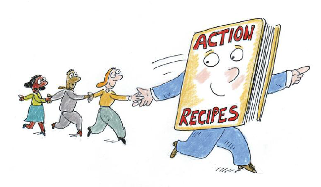• Each topic includes a menu of action recipes to choose from. Whether living in an apartment, a condo, a house or a dorm, team members find and select several actions in each topic which they most want or need to take and are practical to do in their household. Local resources may be available which support team members in taking action.
